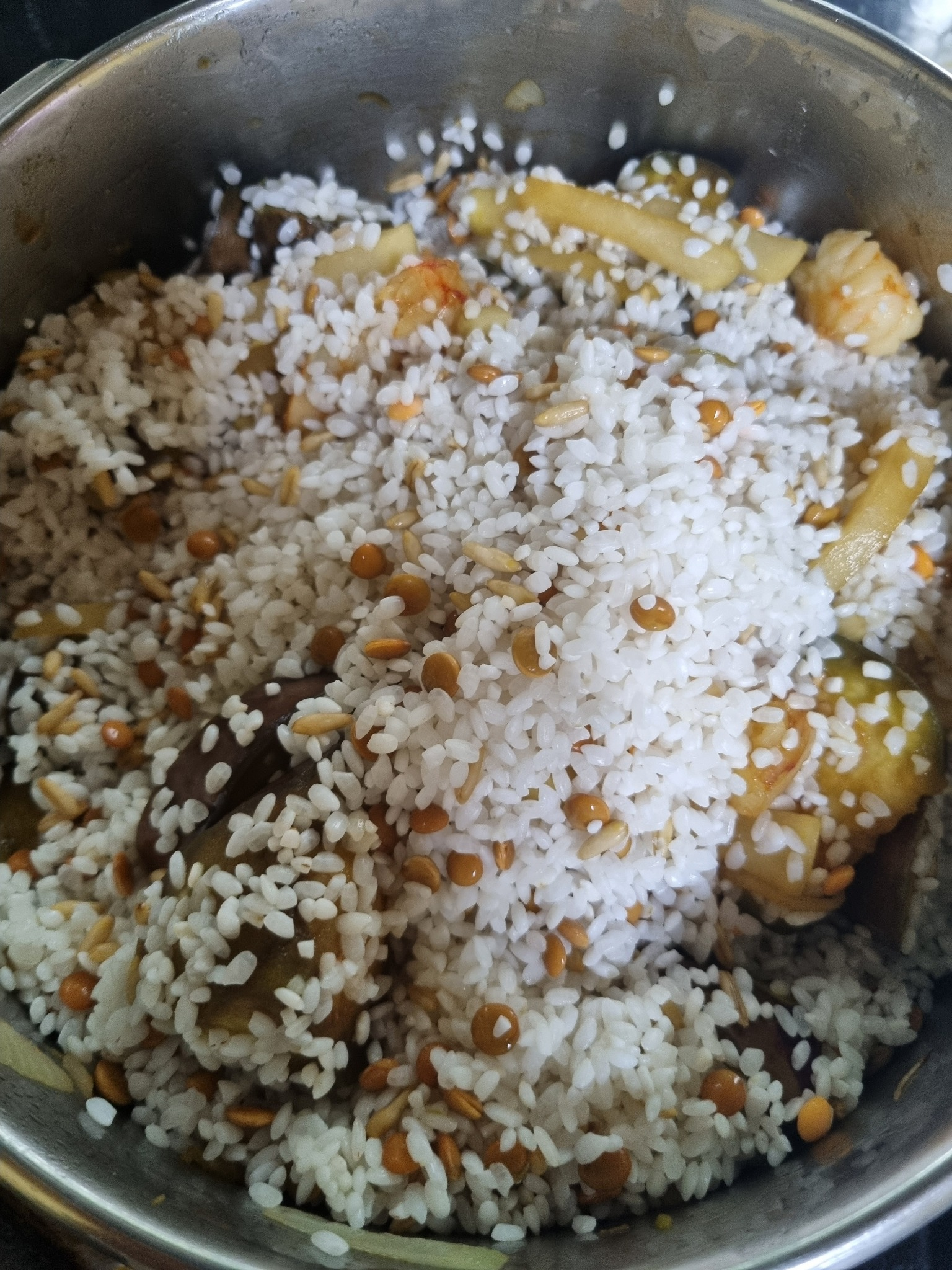 - 불린 쌀 5컵을 넣어 재료와 고루 섞으며 볶습니다.