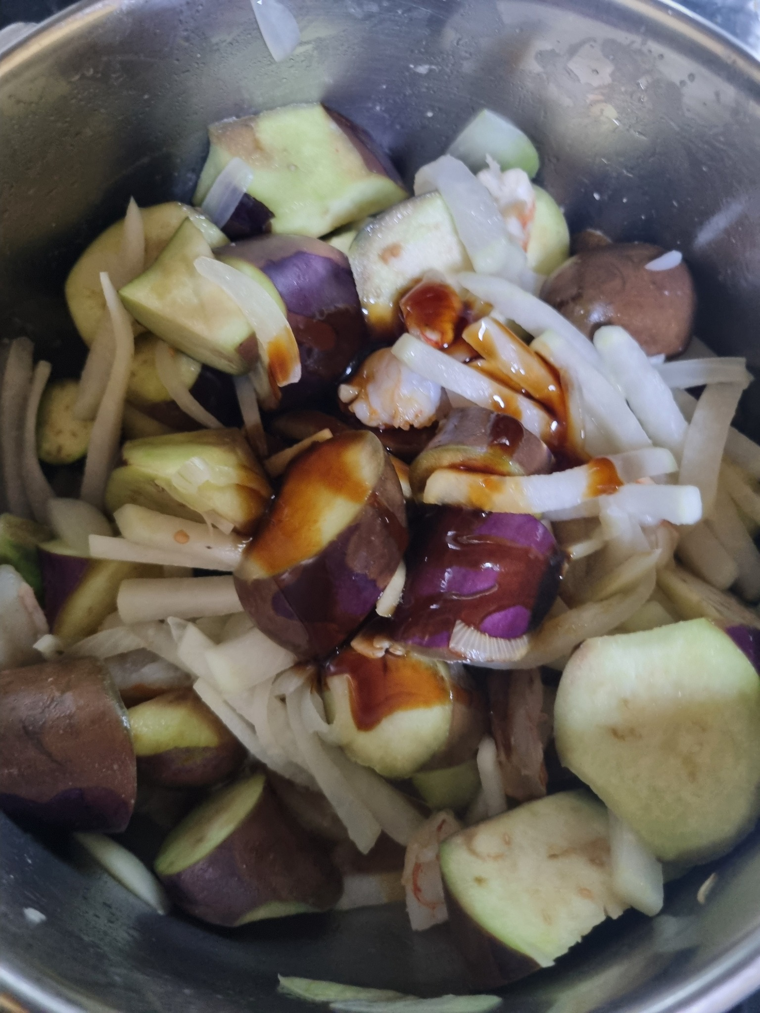 양파 → 무 → 가지→ 새우 순으로 넣고 볶아줍니다. - 이어서 버터 1T를 넣어 풍미를 더하고,