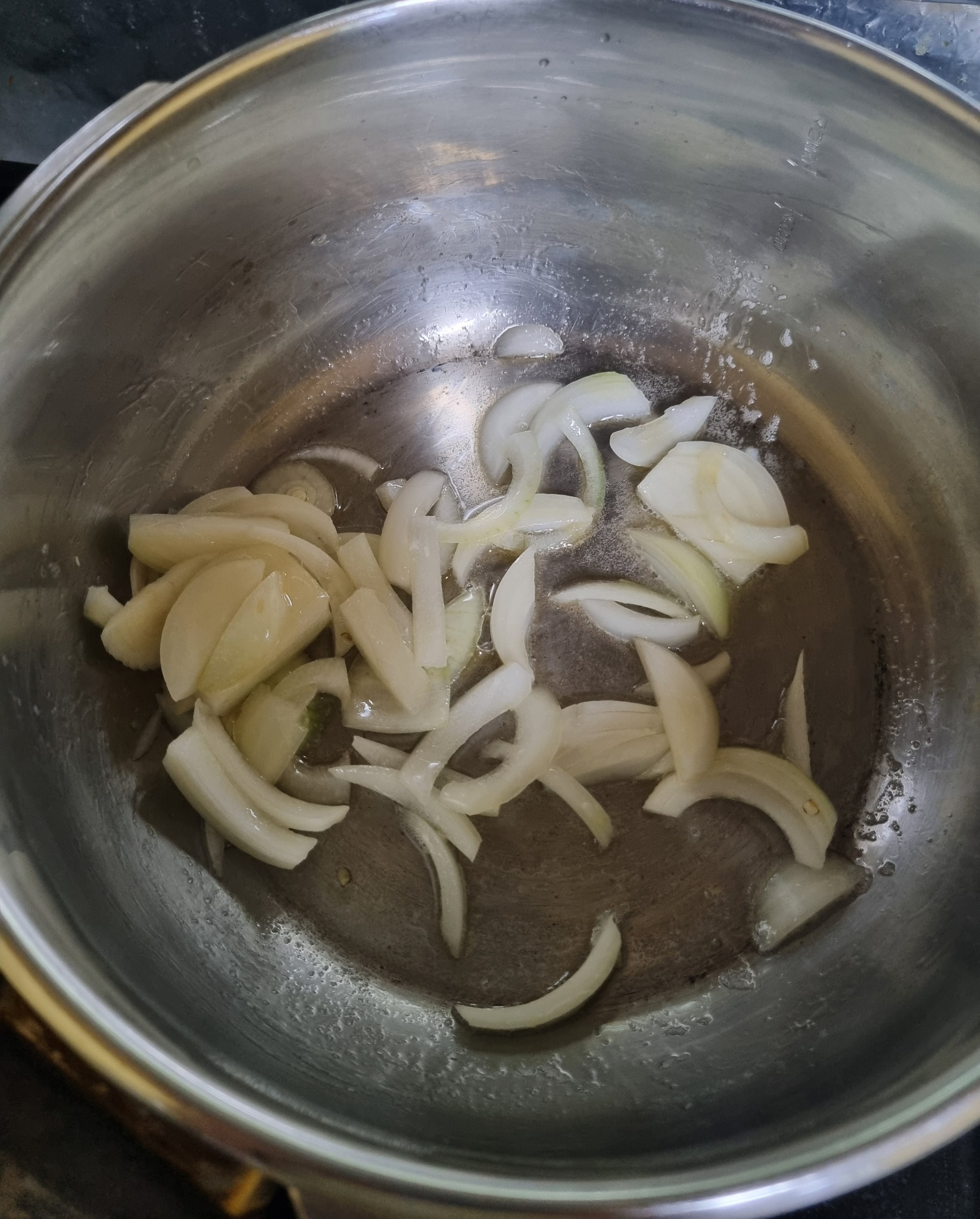 - 압력솥에 불을 켜고 참기름 3T를 두른 후,