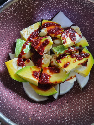 - 냄비 바닥에 무 → 감자 → 호박 순으로 깔아줍니다.