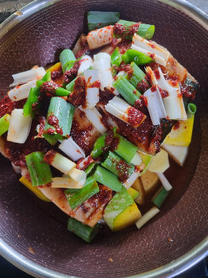 - 대파와 청양고추를 올리고 남은 양념장을 얹습니다.