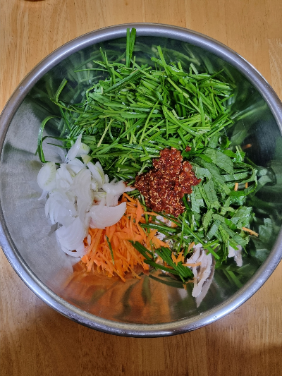 - 큰 볼에 닭가슴살, 채소, 양념장을 넣고 고루 버무립니다.
