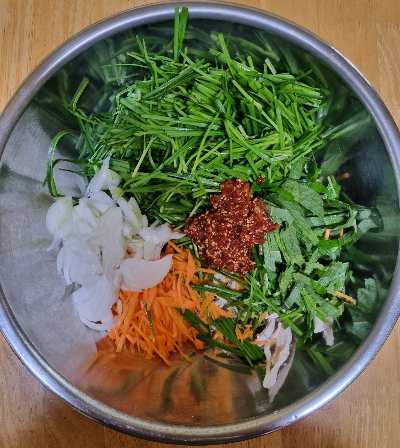 - 당근, 부추, 깻잎, 양파를 깨끗이 씻어 채 썰어 준비합니다.