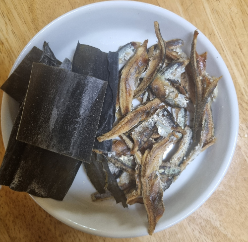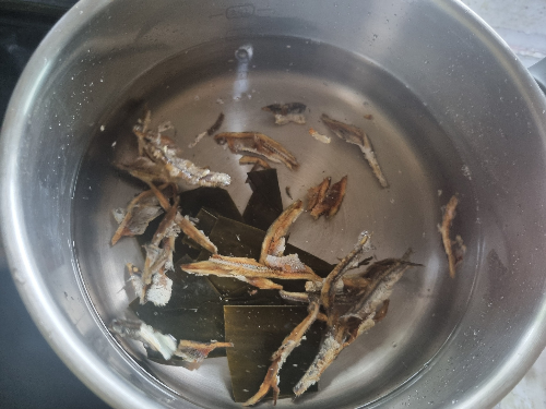 냄비에 물 1.5L, 멸치, 다시마를 넣고 끓이다가 끓어오르면 10분간 더 끓여주고