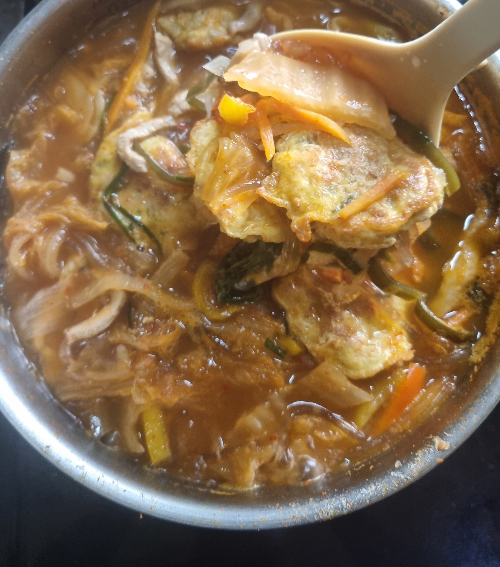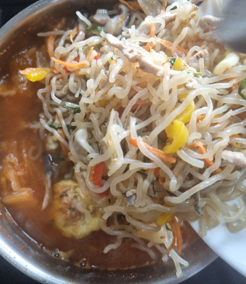 전과 잡채가 들어가니 국물이 훨씬 깊고 시원해져요.