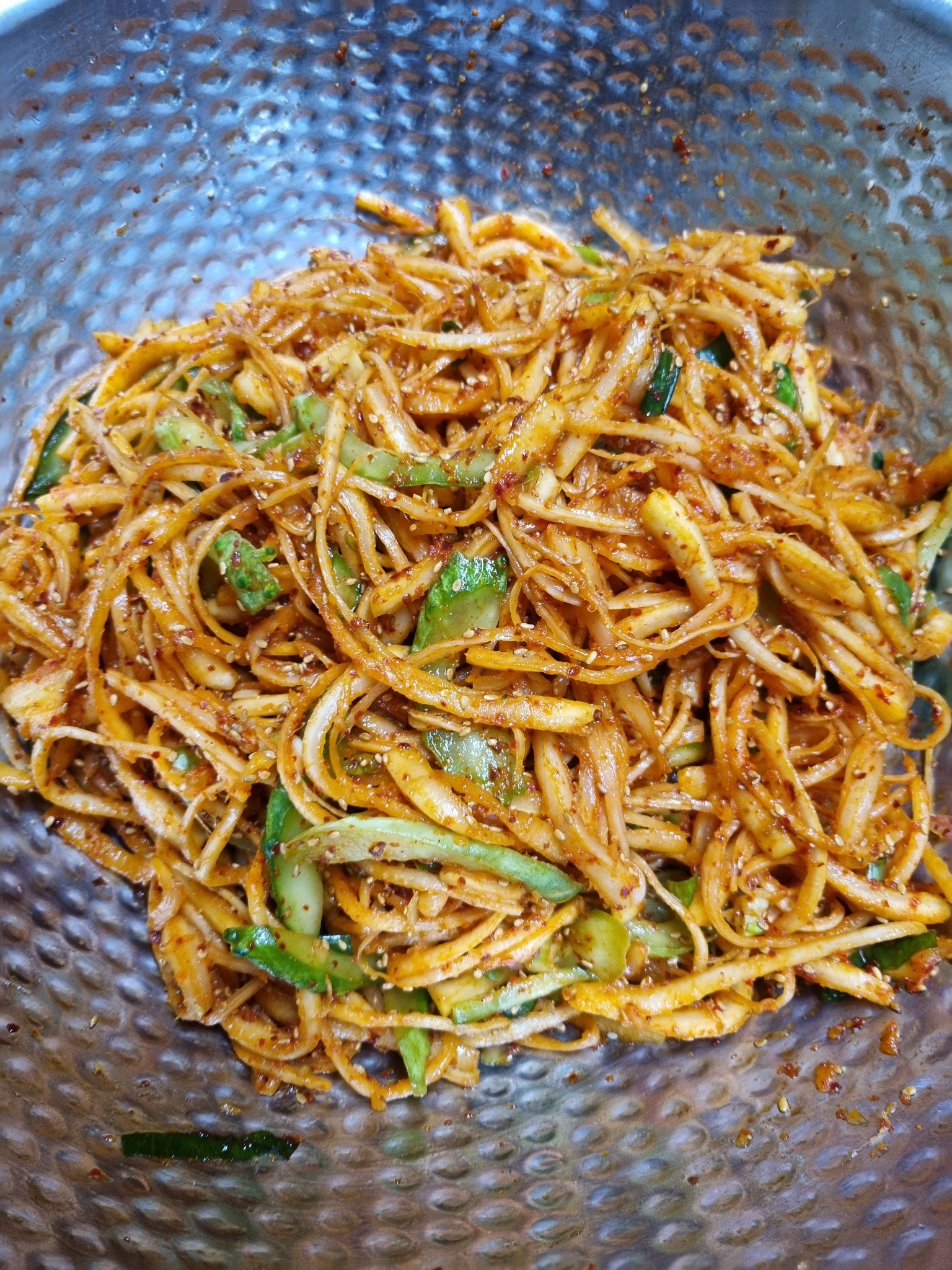 물기를 뺀 도라지와 오이와 송송썬파에 양념장을 넣고 골고루 버무려줍니다.
