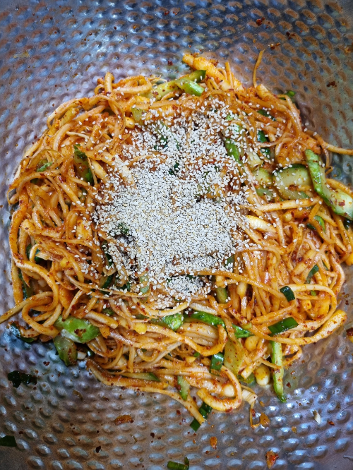 마지막에 참깨를 넉넉히 뿌려 마무리하면 완성입니다 🥢