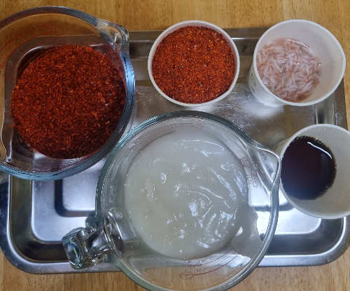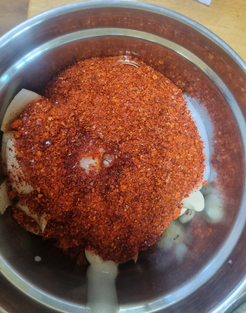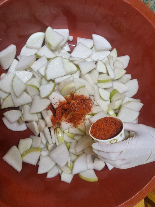 | 고춧가루 | 300ml | 양념용 (200ml + 100ml (무에 색깔입히기용) |