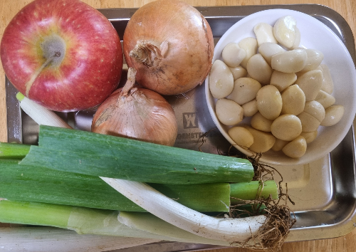 믹서기에 썰어놓은 사과 1개, 양파 2개, 생강 2쪽, 마늘 190g, 매실청 3, 찹쌀풀 300ml,