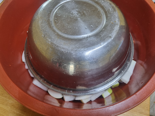 뚜껑을 덮어 1시간 두었다가 한 번 뒤집어주고, 총 2시간 동안 절입니다.